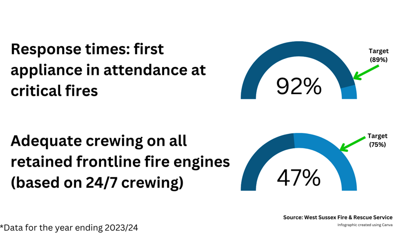 While the service’s response times are regularly above target, West Sussex Fire & Rescue Service recognises that its retained crewing availability has been below target for several years – a reflection of the national picture. However, during the COVID-19 pandemic there was a significant increase (of around 20%) in retained availability as more people were at home during lockdown and available to respond to emergencies in their local area.